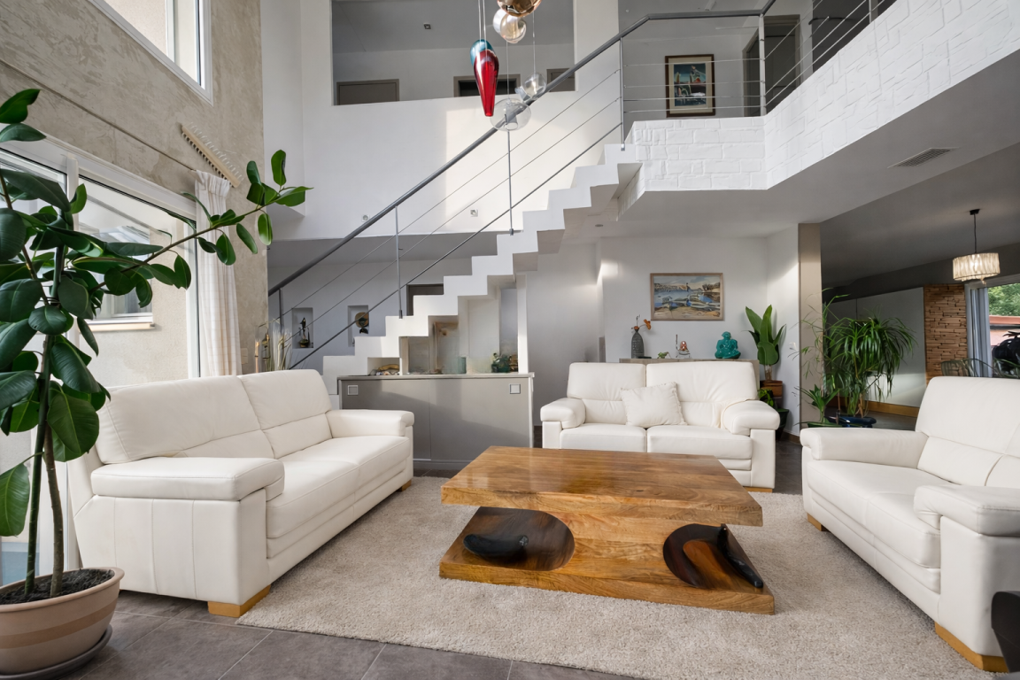 It offers a bright living area with generous volumes and a fully equipped open kitchen, a beautiful double lounge with a double-sided fireplace, four bedrooms including one ground-floor suite, and a dressing room or office.